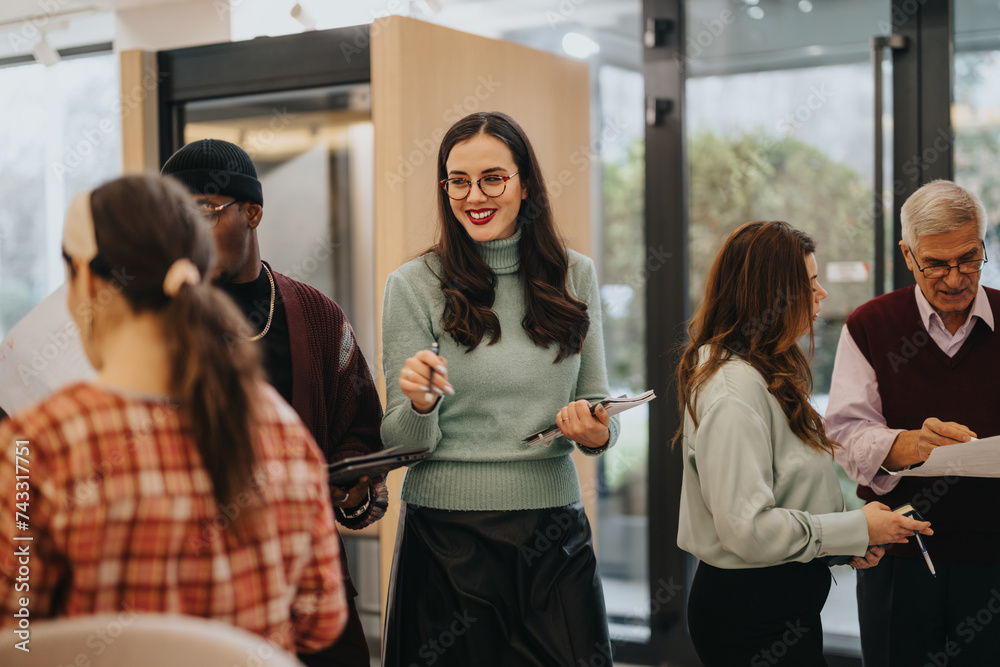 A diverse team of people shares documents and ideas during a collaborative casual business meeting in a bright, contemporary office environment.