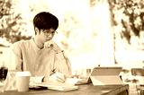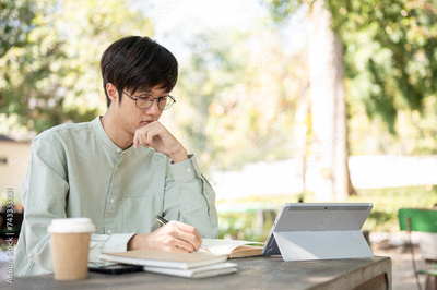 A smart Asian male university student is doing homework or studying online on his digital tablet.