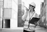 worker or engineer using walkie talkie and talking about work in containers warehouse storage