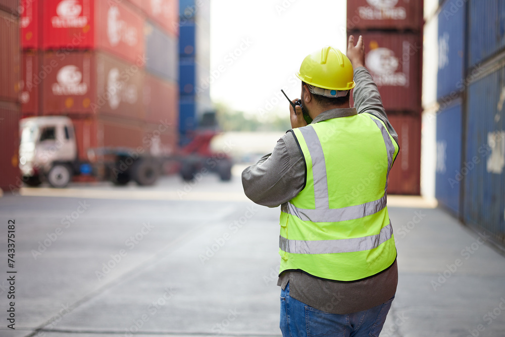 back view worker or engineer using walkie talkie and showing gesture to crane car in containers warehouse storage