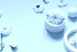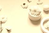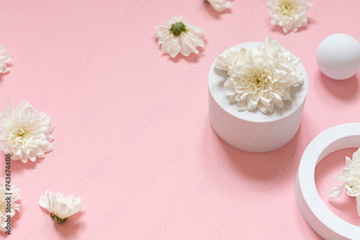 White round geometrical shapes with white chrysanthemum flowers on the pink background. Top view. Floral abstract composition