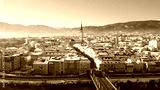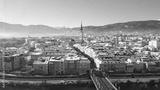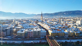 Panorama view of the city Villach in Carinthia, Austria. Big city with beautiful church and mountains on the background. Taken in the winter.