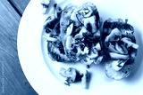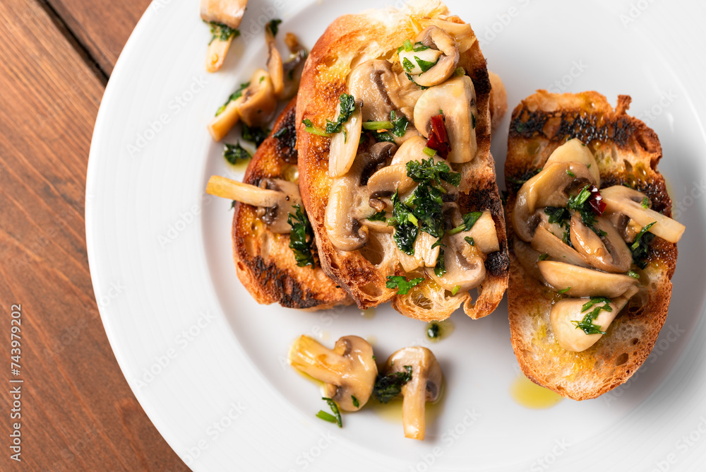 Deliziosi crostini conditi con olio di oliva, prezzemolo e funghi, spuntino vegetariano