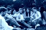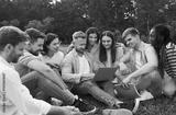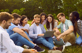 Happy diverse multiethnic friends sit in green park, use modern laptop computer, work on business research group project together, fill out digital application for successful science students contest