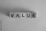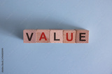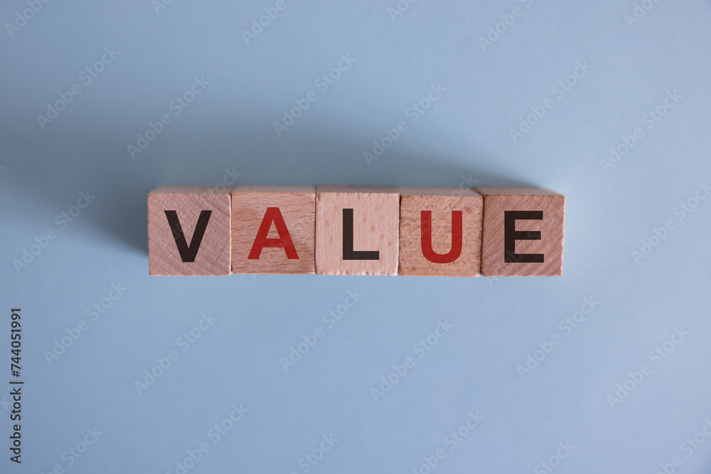 Value symbol. Concept word value on wooden cubes. Businessman hand. Beautiful grey background with succulent plant. Business and value concept. Copy space. Concept word.