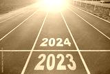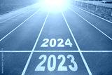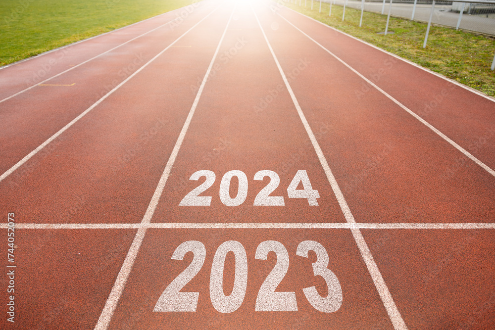 Happy new year 2024 symbolizes the start of the new year. Rear view of a man preparing to run on the athletics track engraved with the year 2024. The goal of Success. Getting ready for the new year.