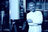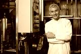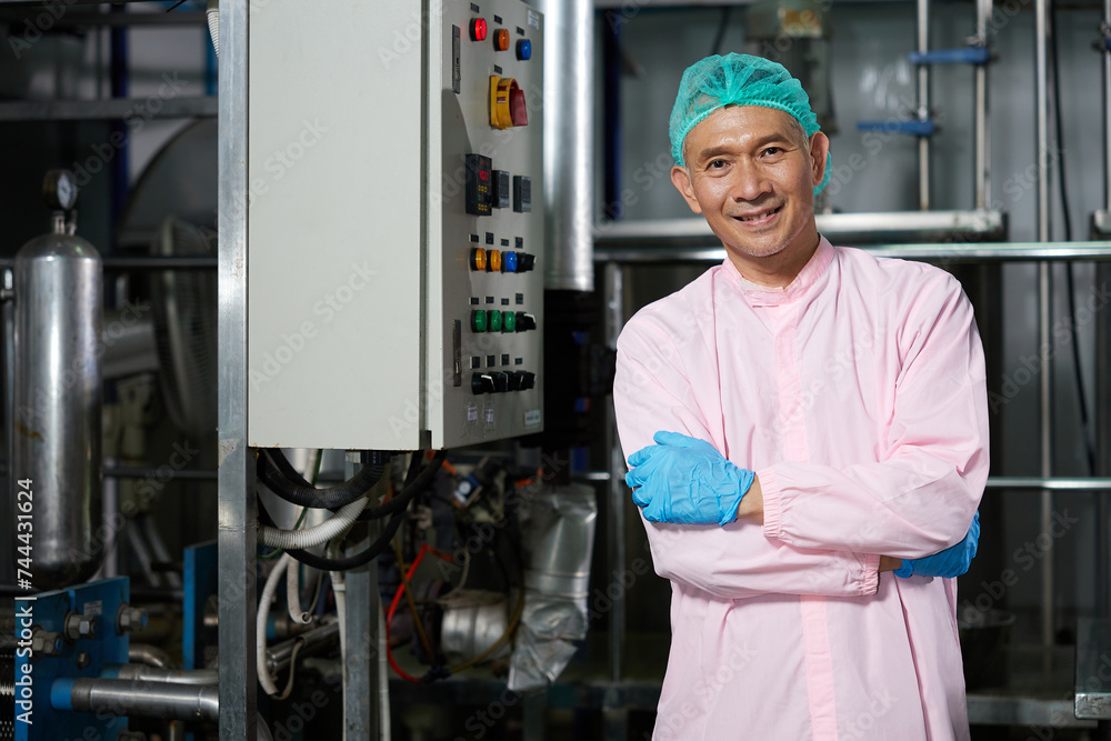 senior worker smiling and folded arms pose beside machine control panel in the factory
