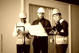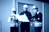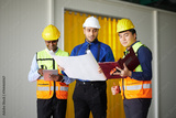 workers and architect holding plan blueprint paper and looking to something at construction site