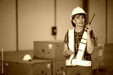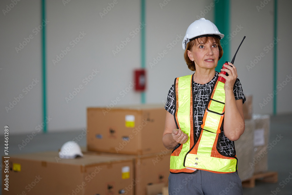 senior worker talking on walkie talkie in the warehouse storage