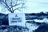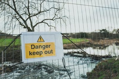 Shallow focus of a Danger Keep Put sign seen next to a barrier which has been erected due to flooding of a nearby English river.