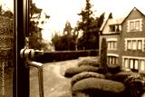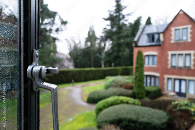 Shallow focus of the handle and glass seen on an opened hotel balcony window. The fine landscaped gardens are complex can be seen, assert a heavy downpour.