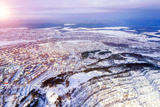 Flight over the roofs of multi-storey buildings of a typical city of Russia