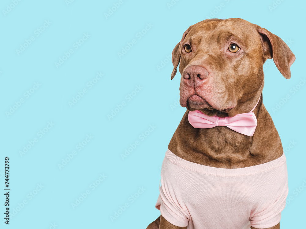 Cute brown puppy and bow tie. Close-up, indoors. Studio shot. Congratulations for family, relatives, loved ones, friends and colleagues. Pets care concept