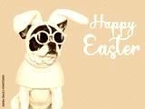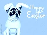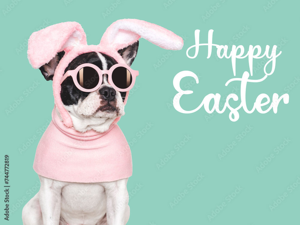 Happy Easter. Lovable, pretty puppy and congratulatory inscription. Closeup, studio shot, indoors. Day light. Congratulations for family, loved ones, relatives, friends, colleagues. Pet care concept