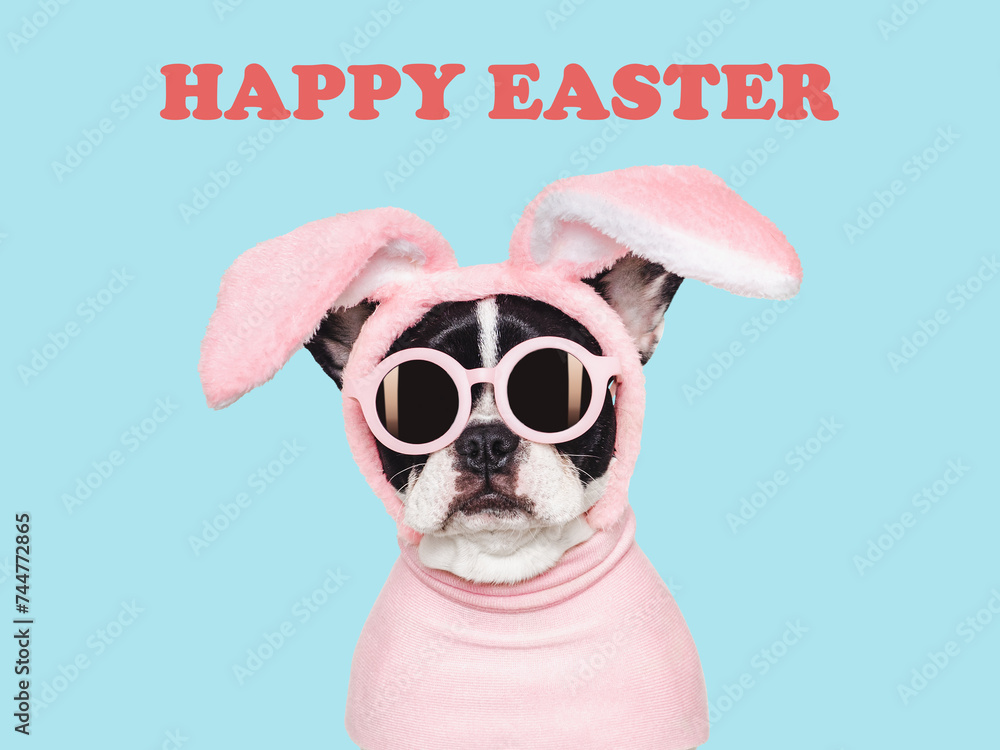 Happy Easter. Lovable, pretty puppy and congratulatory inscription. Closeup, studio shot, indoors. Day light. Congratulations for family, loved ones, relatives, friends, colleagues. Pet care concept