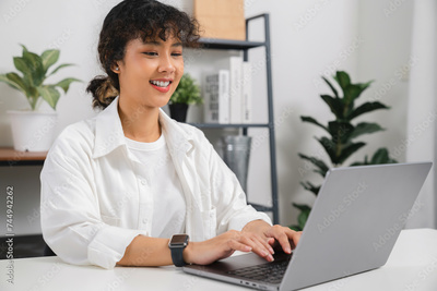 Happy young Asian woman using laptop and checking email inbox, social media messages on the table in modern home.