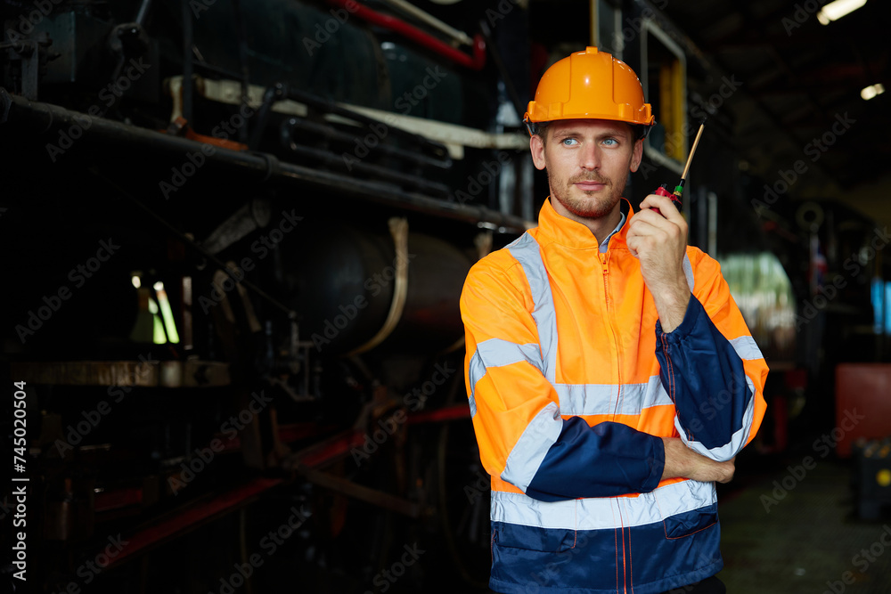 worker using walkie talkie and talking about work at construction train station