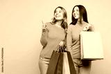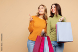 Young friends two women they wear orange green shirt casual clothes hold in hand shopping package bags point finger aside on area isolated on plain beige background. Black Friday sale buy day concept.