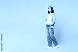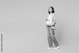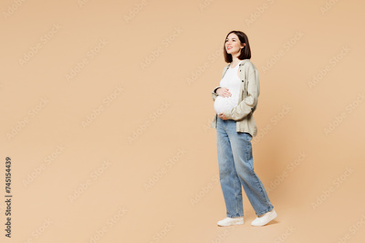 Full body side view young minded pregnant woman future mom in grey shirt with belly stomach stroking put hand on tummy with baby isolated on plain beige background Maternity family pregnancy concept
