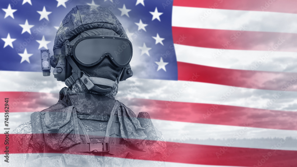 Army soldier with US flag. Soldier from United States of America. Male soldier in helmet and protective camouflage. US army officer in modern uniform. US armed forces. Warrior, fighter