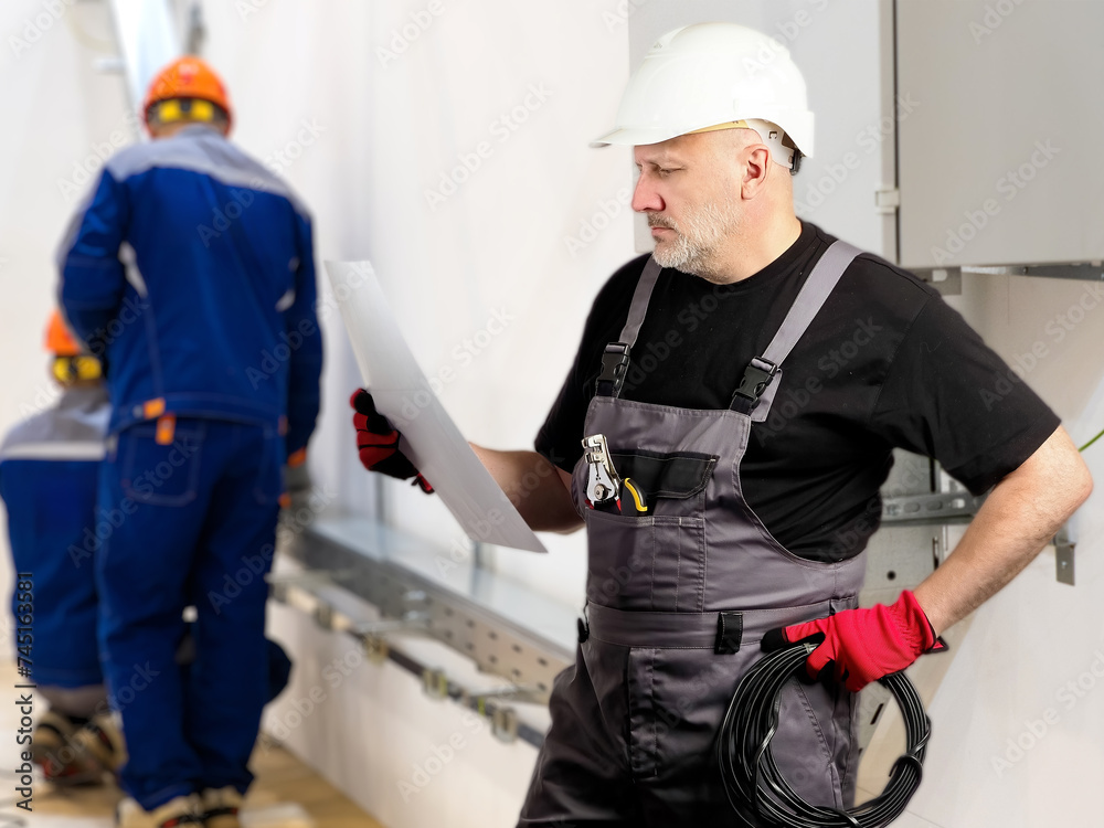 Man electrician with wires in his hands. Electrification specialist holds documents. Electrician man in protective helmet. Electrician controls work with electrical wires. Guys doing electrical work