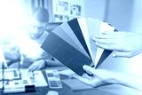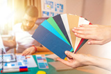 Paper color palette. Designer hands with color options. Web designer sitting at desk is blurred. Palette of cards. Selecting color for applications. Designer chooses shade for website