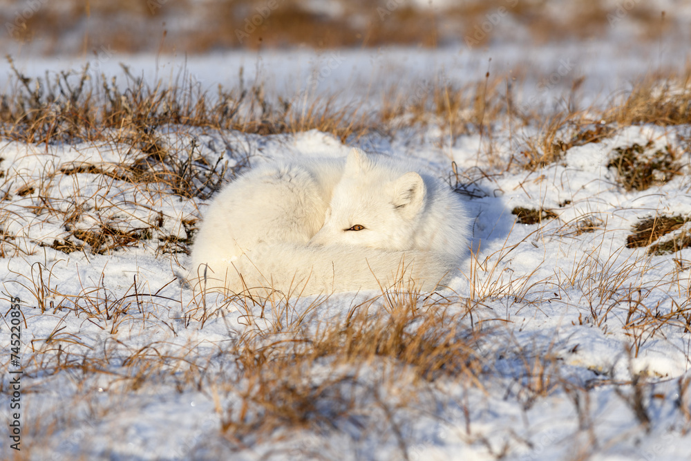 Arctic fox (Vulpes Lagopus) in wilde tundra. Arctic fox lying. Sleeping in tundra.