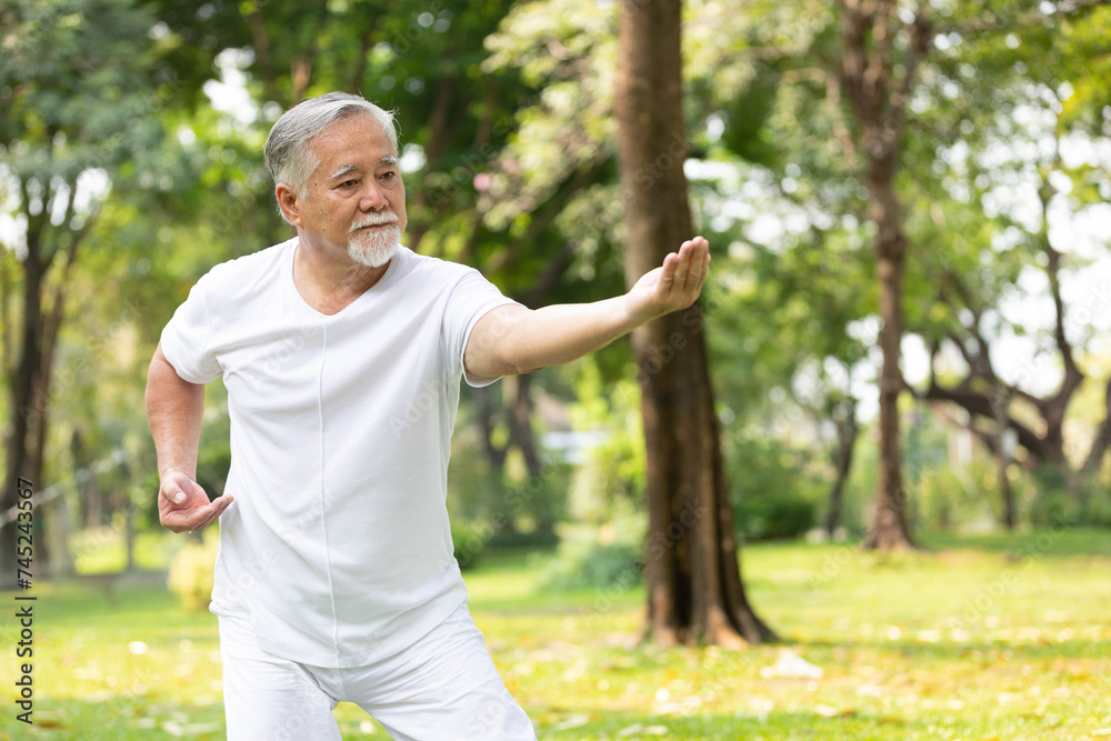 asian senior man workout and practice tai chi in the park