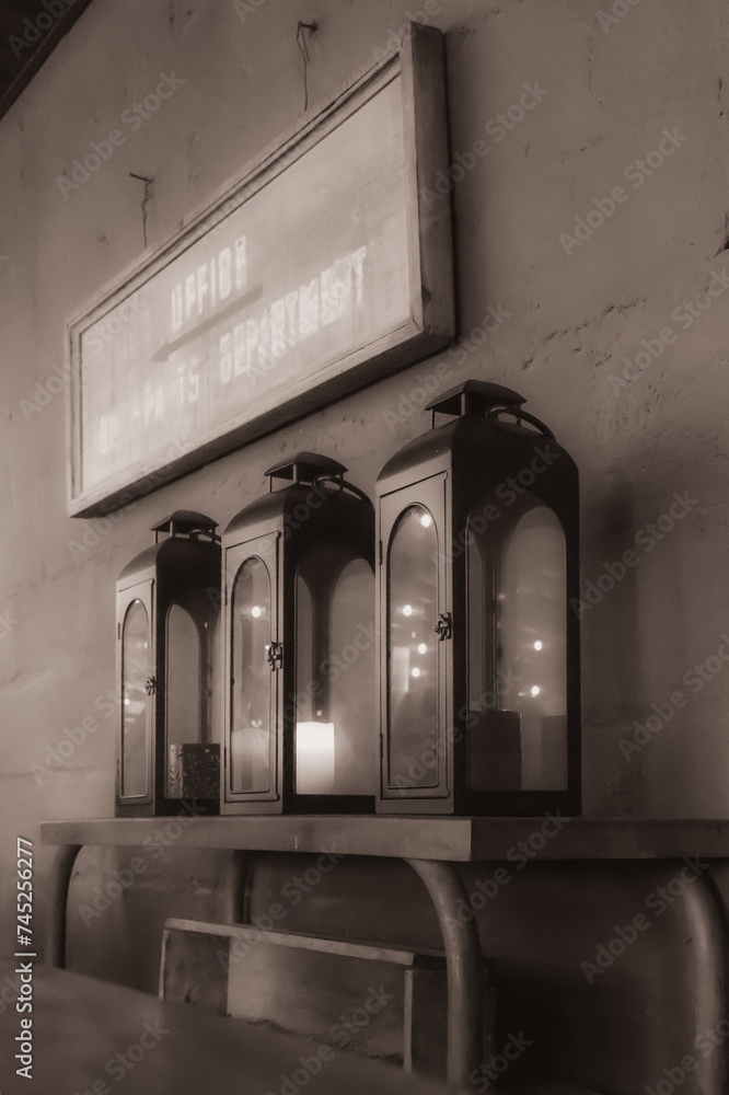 3 Tall Black Glass glass-paneled lanterns sit on a wooden shelf against a red brick wall. Battery operated candle looks rial inside the center lantern.
