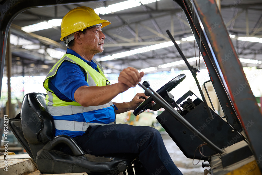 senior worker driving forklift in the factory