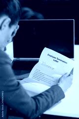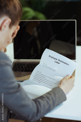 Seen from behind 40 years old woman worker in green office