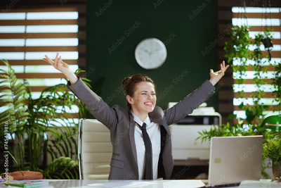 smiling female worker in green office throwing documents