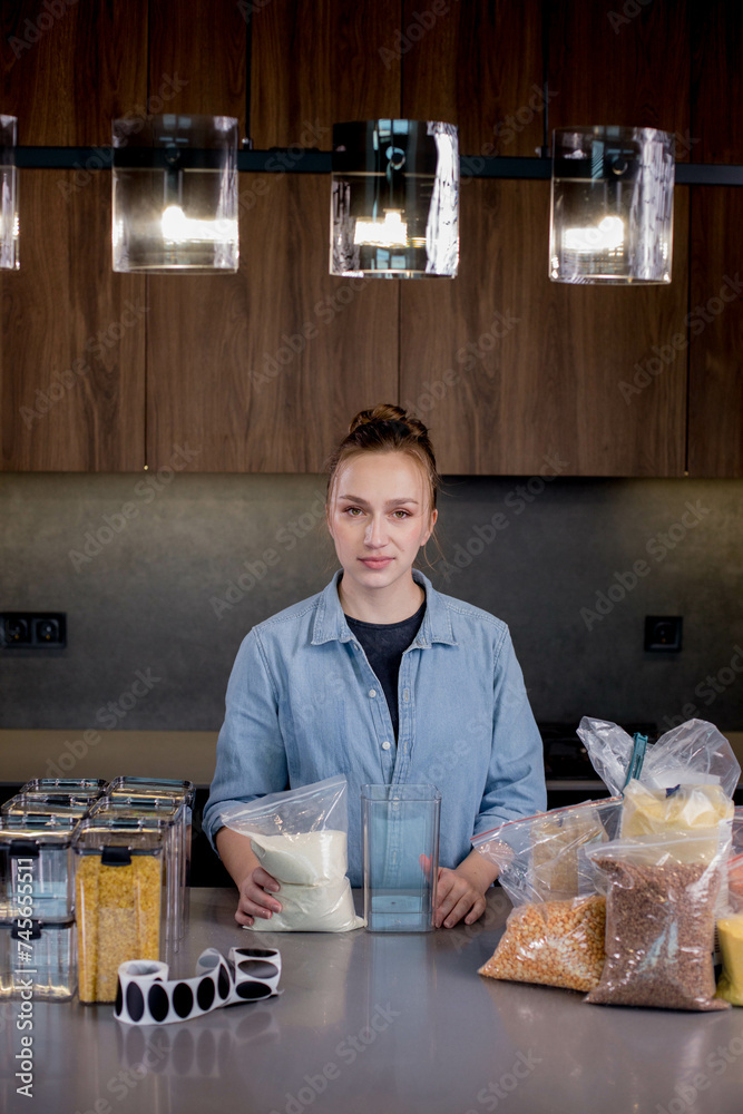A woman uses containers to organize food in the kitchen. Layout and sorting of food products. Management of the organization in the interior of a modern kitchen.