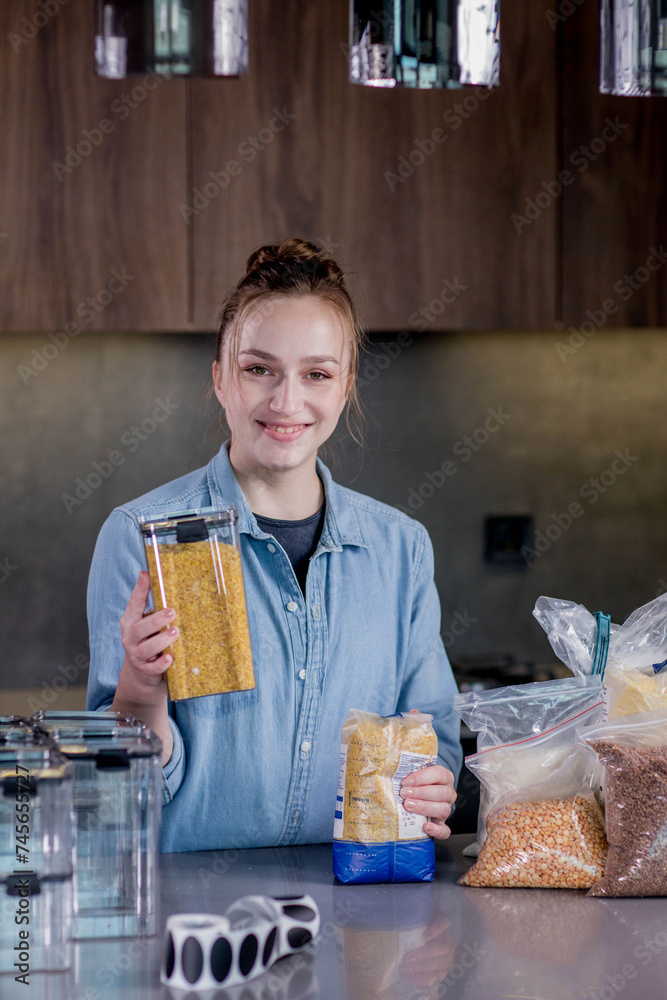 Happy woman professional space organizer smiling posing with plastic case boxes for comfortable product storage.Management of the organization in the interior of a modern kitchen