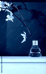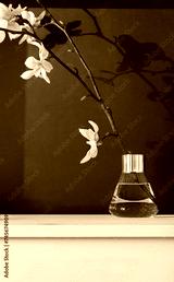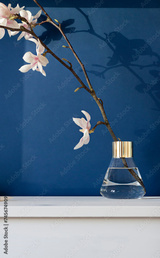 White magnolia flower tree branch in vase on the white chest of drawers. Copy space