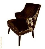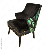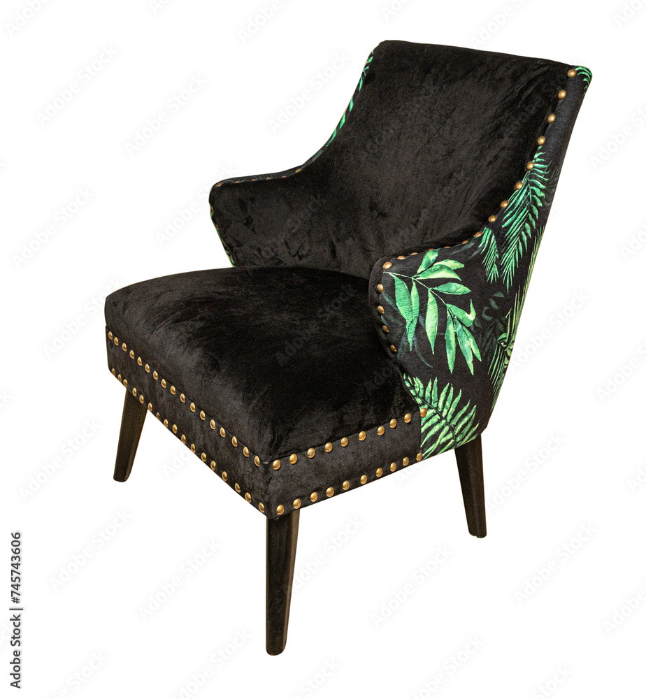 a black armchair covered with a floral print fabric