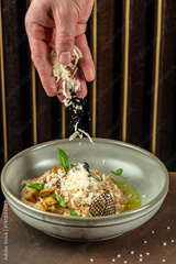 Mushroom Risotto with parmesan on a dark background. copy space for text