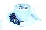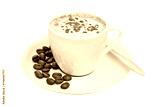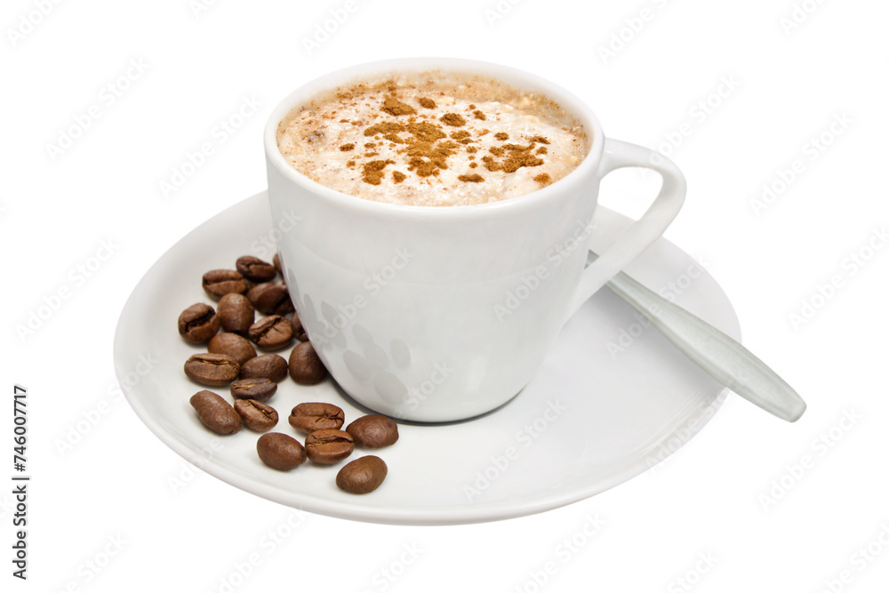 1 Tasse Kaffee mit Kaffeebohnen und Hintergrund transparent PNG cut out