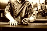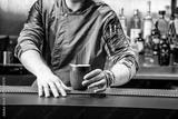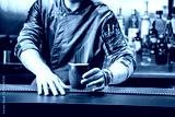 Barman prepara cocktail de piña colada sobre la barra de un cocktail bar nocturno close up con detalles exclusivos