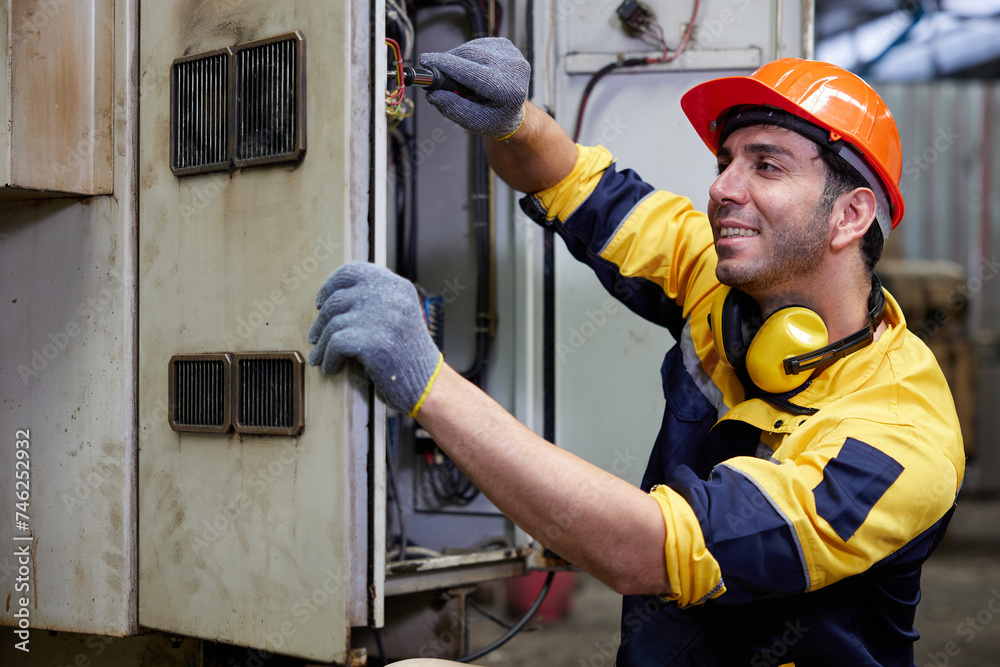 engineer or technician operating industrial control panel in the factory