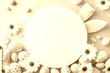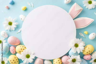 Easter magic setup. Top view image of rainbow-hued eggs, and fragrant spring flora on a pastel blue background, with sweet rabbit ears showing through a free area for loving greetings or advertising