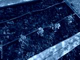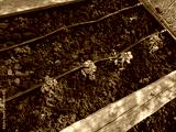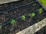 Green tomato seedlings in ground next to micro irrigation hose. Irrigation system in vegetable garden. Gardening, horticulture