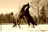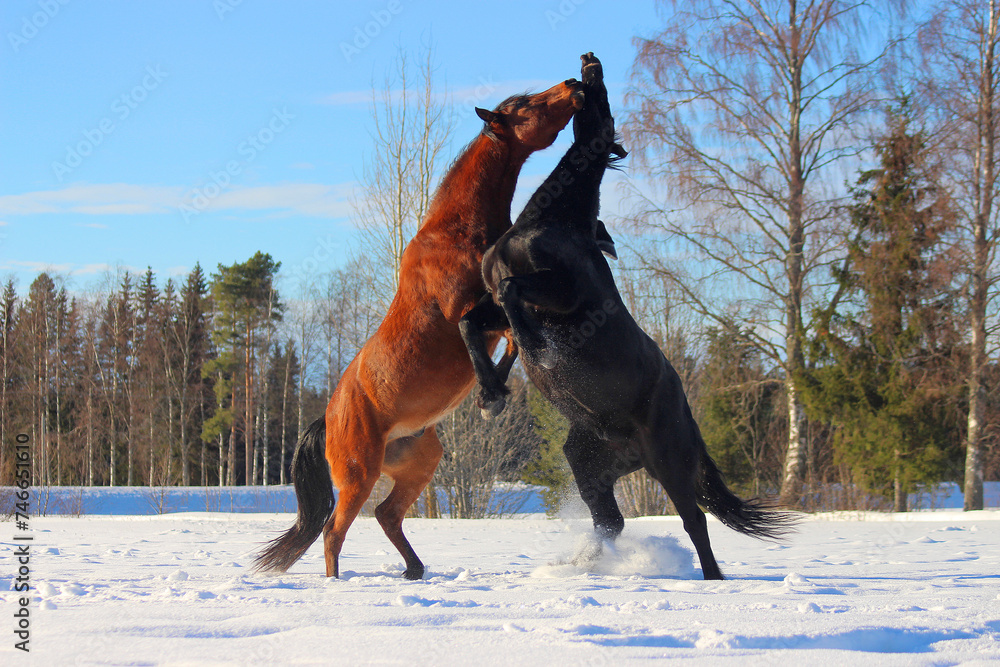horse in winter, During the game, one of the horses stretched its neck, two horses are playing, a bay and black horse are dancing in a game in the snow
