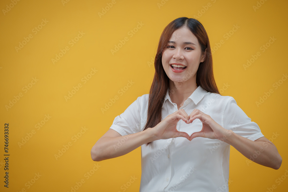 Woman making heart shape gesture for love sign and romantic concept isolated over yellow background