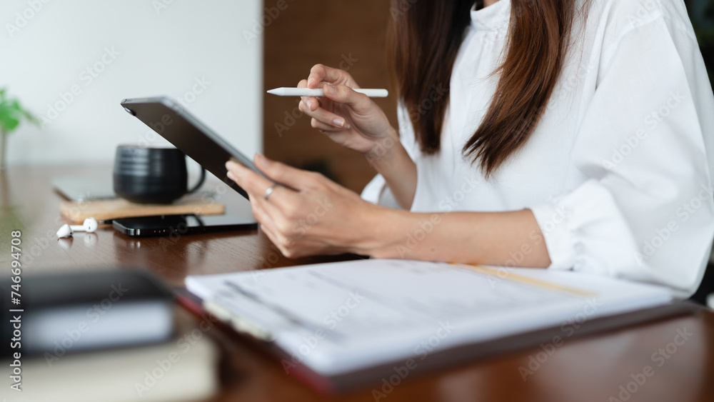 Writer woman is thinking creative ideas and writing business information content on tablet in cafe..