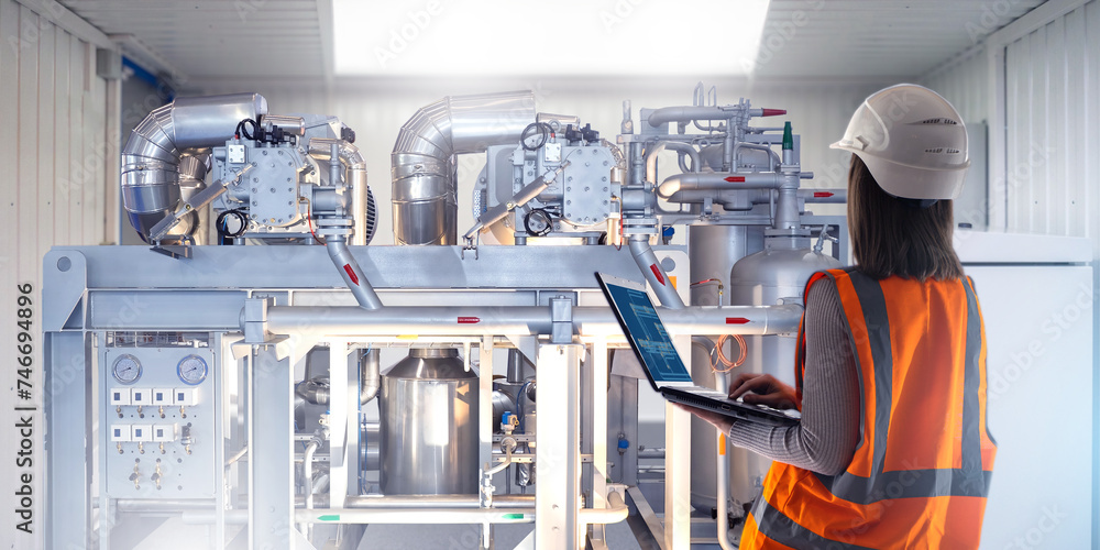 Woman factory technologist. Engineer with laptop near industrial equipment. Girl technologist inspects production. Woman specialist in manufactory building. Inspector checking industrial unit