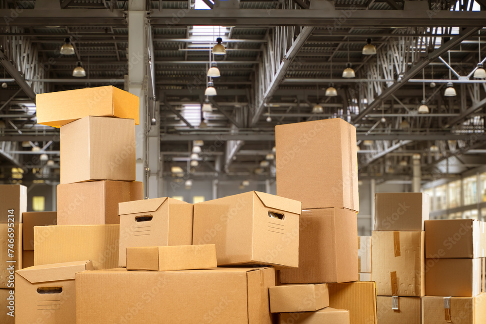 Pile of cardboard boxes. Industrial building with parcels. Boxes inside hangar. Parcels for storing things. Archival boxes with papers. Pile parcels inside production building. Safekeeping, logistics