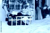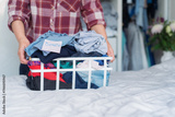 Close up female with basket of selected clothes from her wardrobe for donating to Charity. Decluttering, Sorting clothes And Cleaning Up. Reuse, second-hand concept. Conscious consumer, sustainability