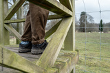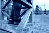 Abstract view of a woman seen standing on a tall observation area who is looking at distant, out of focus rare white dear in a British wildlife park.