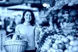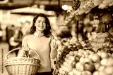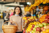 A woman with basket is showing lemons at farmers market and smiling at the camera.